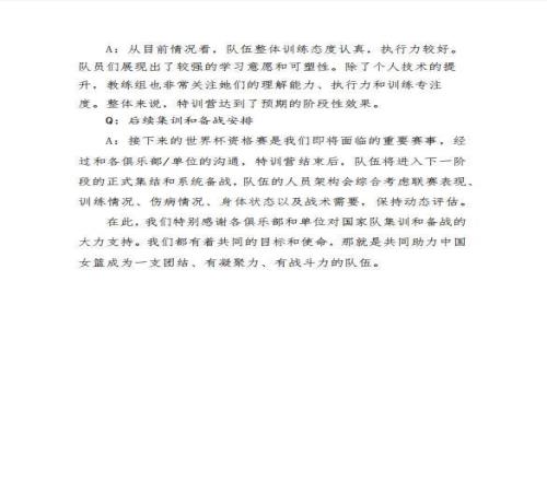 篮协表示,接下来的世界杯资格赛是即将面临的重要赛事,经过和各俱乐部/单位的沟通,特训营结束后,队伍将进入下一阶段的正式集结和系统备战,队伍的人员架构会综合考虑联赛现、训练情况、伤病情况、身体状态以及战术需要,保持动态评估。