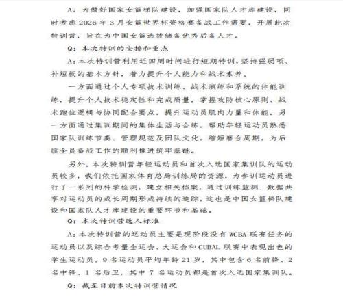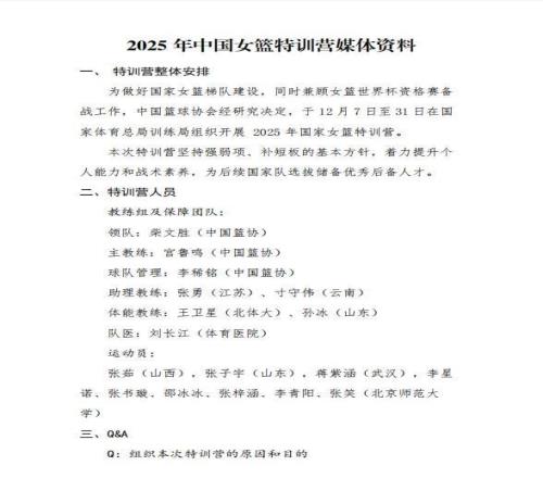 中国篮协官方消息,自12月7日到12月31日举行2025年国家女篮特训营。此次特训坚持强弱项。补短板的基本方针,着力提升个人能力和战术素养,为后续国家队选拔储备优秀后备人才。